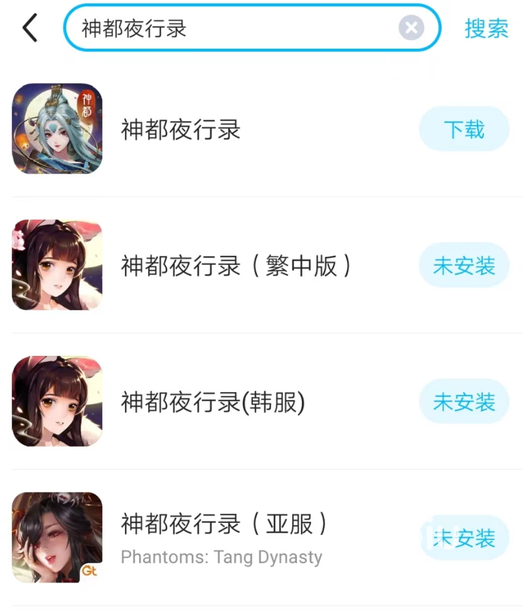然后還可以在里面下載游戲,搜索神都夜行錄就可以看到跳出來很多的服務(wù)器,找到韓服來下載就行了。