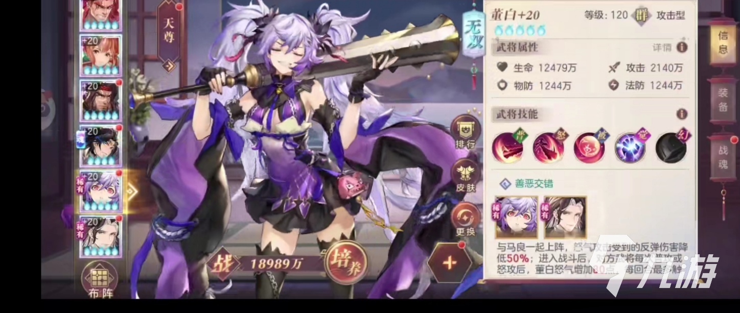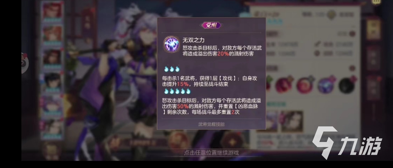 當(dāng)然和三國(guó)志幻想大陸這款游戲中的其他的角色一樣,董白也擁有自己的覺(jué)醒技能,全稱叫做無(wú)雙之力,能夠在玩家用上面的怒攻擊殺目標(biāo)之后,對(duì)敵方的每一個(gè)存活武將造成溢出傷害20%的濺射傷害,也就是說(shuō)使用怒攻擊殺武將之后,玩家還能夠?qū)⑴ピ斐傻膫D(zhuǎn)移到其他的武將身上,等到董白的星級(jí)提升之后這個(gè)技能甚至可以在怒攻擊殺目標(biāo)之后,對(duì)敵方每個(gè)存活的武將造成溢出傷害50%的濺射傷害,傷害會(huì)越來(lái)越高,最終甚至還可以重置兇惡血脈的剩余次數(shù),讓玩家能夠多用幾次這個(gè)兇惡血脈的被動(dòng)技能。