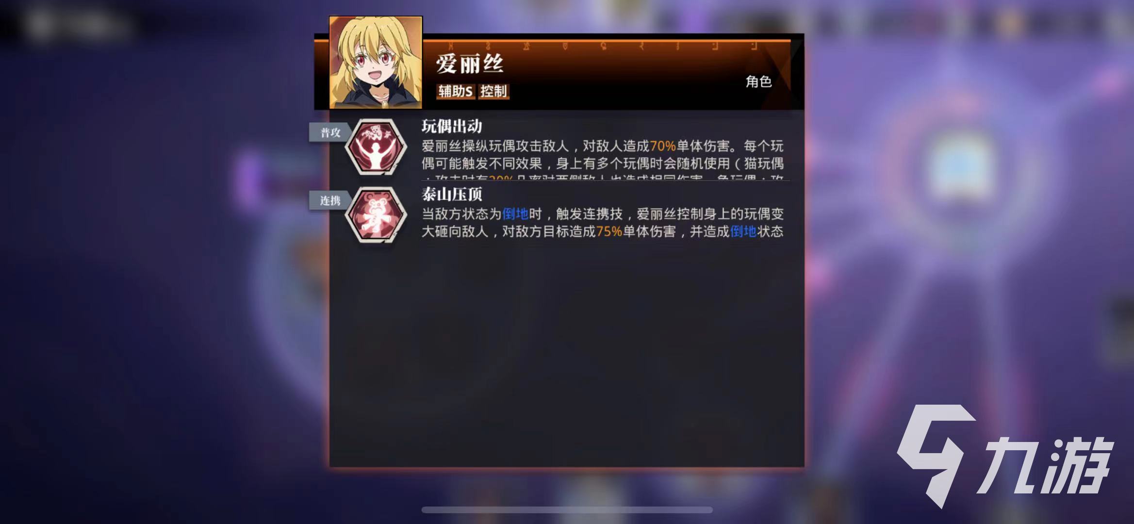 愛麗絲是控制型角色,普攻可以對敵人造成70%傷害,沒有必殺但身上有多個玩偶,每一個都可以觸發(fā)不同的效果,也可以眩暈敵人。