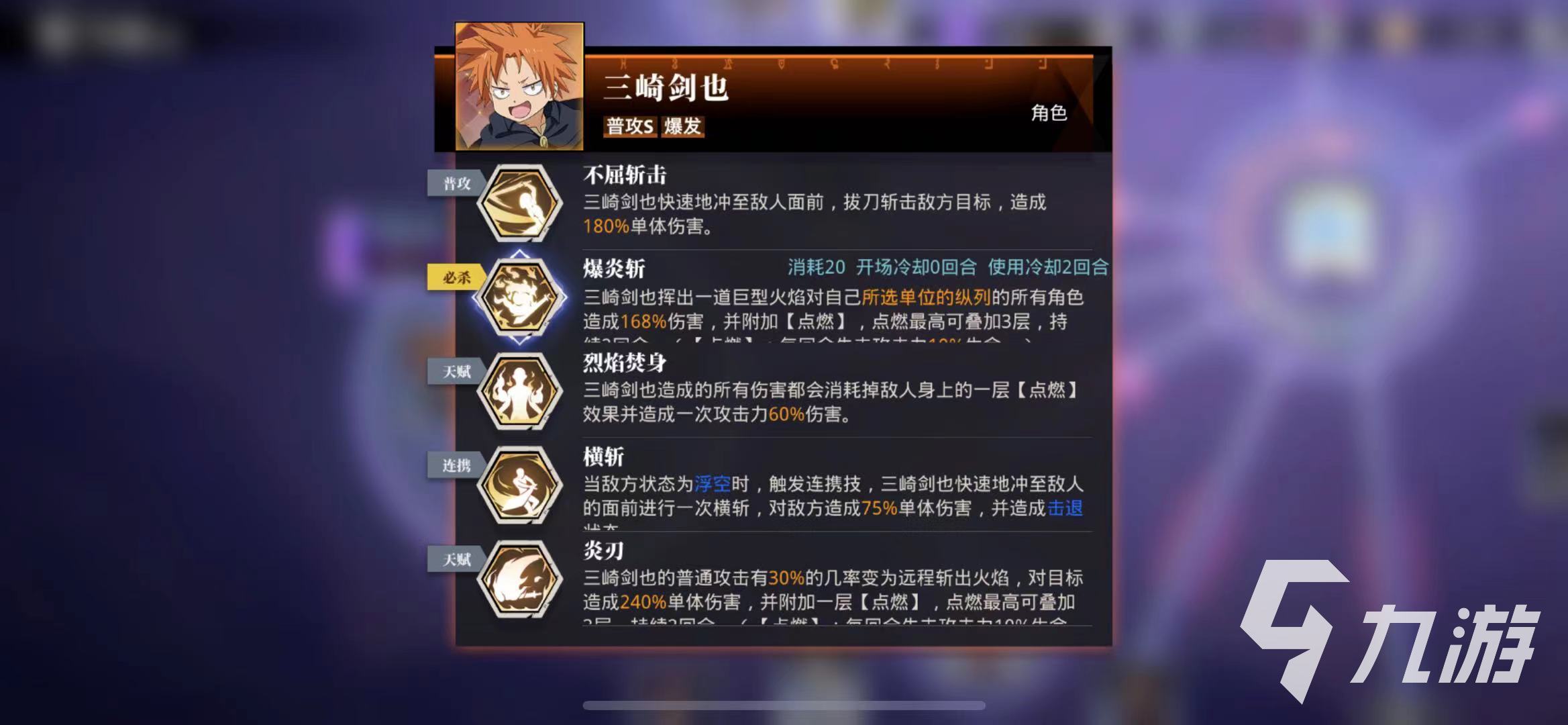 三崎劍也是爆發(fā)型角色,普攻可以造成敵方目標(biāo)180%傷害,必殺可以對選定單位的縱列所有角色造成168%傷害并附加【點燃】持續(xù)兩回合(【點燃】:每回合失去攻擊力10%生命),天賦炎刃更是可以將普通攻擊30%的幾率變?yōu)檫h(yuǎn)程斬出火箭,對目標(biāo)造成240%單體傷害。