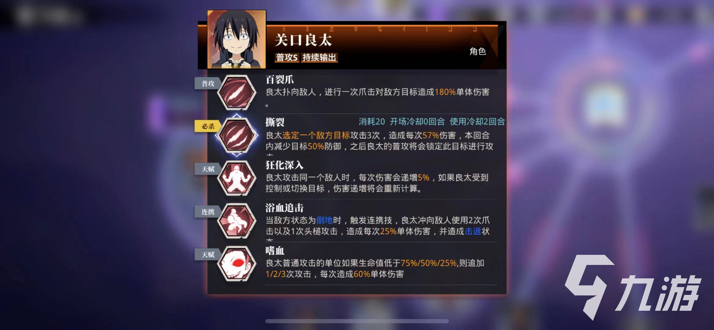 關(guān)口良太是持續(xù)輸出型角色,普攻可以給敵方目標(biāo)造成180%單體傷害,必殺可以選定一個敵方目標(biāo)攻擊3次,造成每次57%傷害,且當(dāng)次回合減少目標(biāo)50%防御,之后的普攻也會鎖定此目標(biāo),如果良太普通攻擊單位生命值低于75%、50%、25%那么天賦嗜血則追加1/2/3次攻擊,每次造成60%單體傷害。