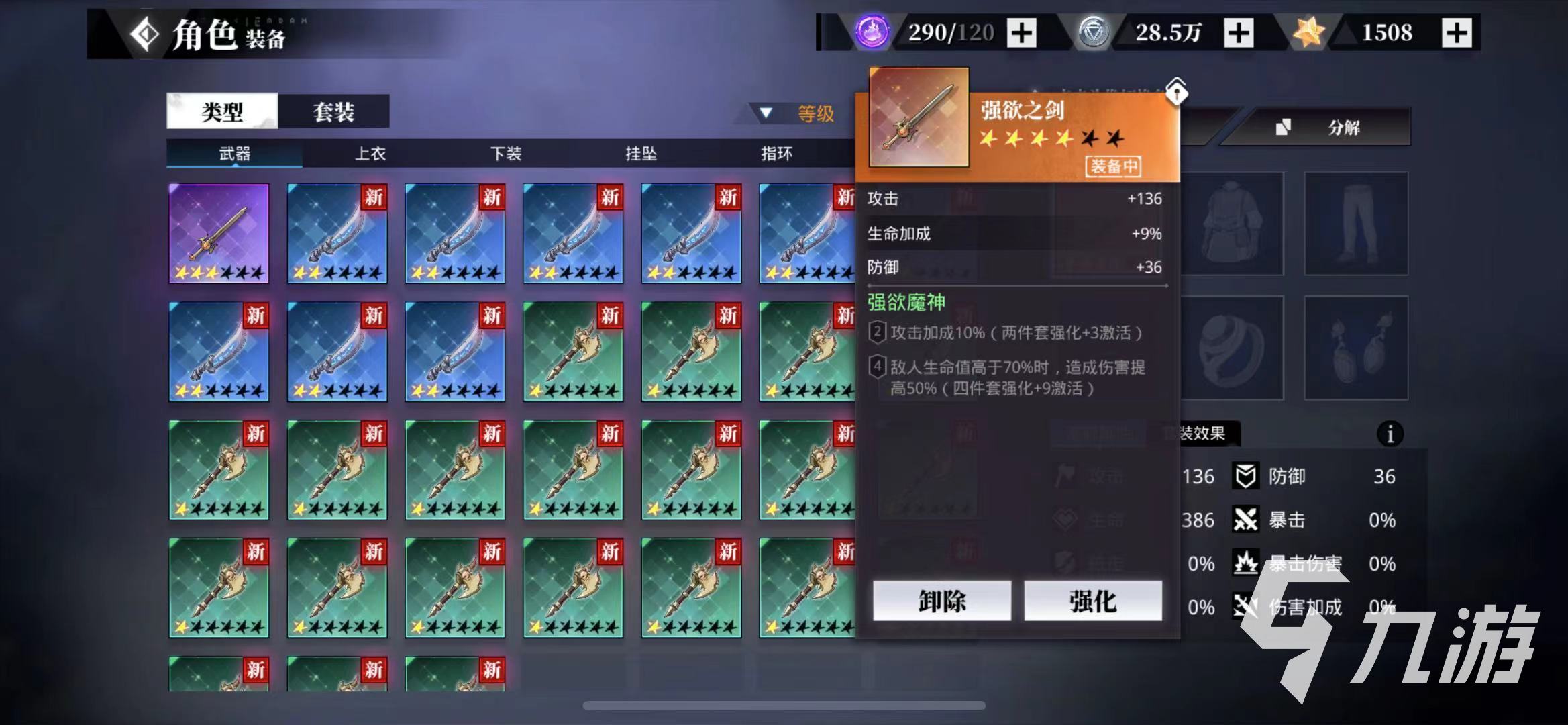 強欲之劍佩戴以后會給角色各個方面屬性提供加成,攻擊+136,生命+9%,防御+36,如果玩家全身裝備都是強欲系列的話就可以激活強欲魔神的技能,激活技能可以給玩家攻擊加成多提升10%(兩件套強化+3激活),敵人生命值高于70%時,造成傷害提高50%(四件套強化+9激活)。