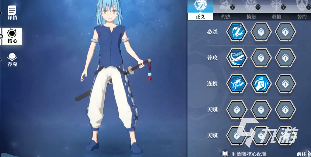 利姆魯所謂的核心簡單來說就是技能的套路體系,這個是其他角色沒有的。角色的技能能力除了可以提升之外,是無法進行改變的。而利姆魯就不一樣了,是有多個技能套路設(shè)定的。分貝是正義、灼熱、憤怒、救恤和誓約這幾個分類的。在剛開始游戲的時候,利姆魯是只有正義這個技能設(shè)定的。