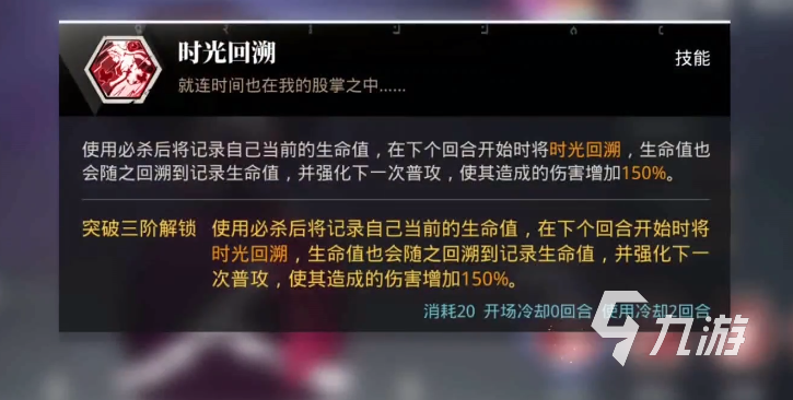 必殺:這個技能使用之后會記錄當前的血量,在下個回合會直接恢復到記錄的血量,同時強化下一次普攻,造成的傷害會增加150%。