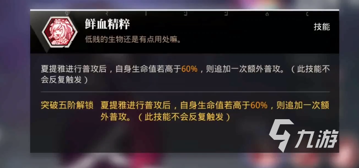 天賦2:夏提雅在進行普攻之后,如果說本身血量是高于60%的話,那么就會觸發(fā)一次額外的攻擊。這個攻擊每個回合只可以出發(fā)一次,不可以重復觸發(fā)的。這個技能在血量高的時候還不錯,低血量就相當于少一個技能。