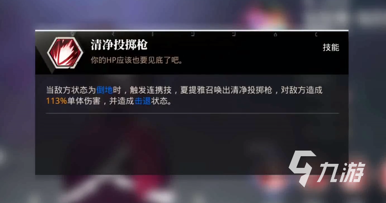 連攜技能:當敵人為倒地的時候會觸發(fā),使用投擲槍來進行攻擊,造成單體的傷害之后還會附加一個擊退的效果。這個需要有前置來觸發(fā),后續(xù)可以連上擊退的連攜技能。