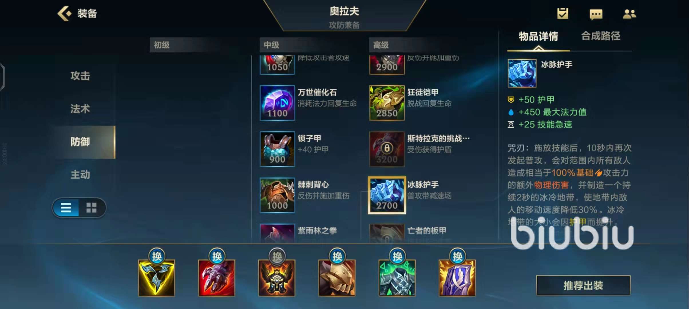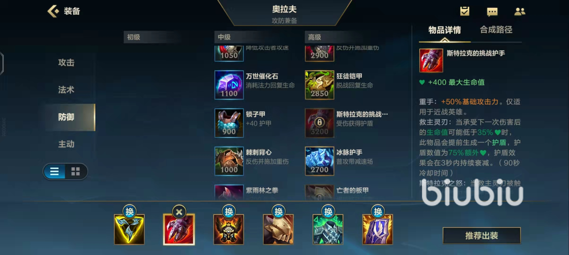 2、逆風(fēng)局裝備:血手、復(fù)活、藍(lán)盾、抵抗鞋、冰泉、其他抗性裝備,逆風(fēng)局的話就不要想著輸出裝備,需要做的就是堆積血量的,不要怕單帶做好視野和熟練使用大招,前期出裝和順風(fēng)局一樣。