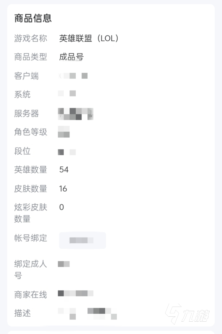 在交易貓中,只要瀏覽到有心儀的賬號,點擊一下便可查看賬號的所有信息,包括游戲的區(qū)服,擁有的角色數(shù)量,皮膚數(shù)量等等,并且可以隨時咨詢商家詢問更多的賬號信息和議價,讓我們更加容易知道各種賬號的信息,對多個賬號進行比較,從而挑選到最適合自己的賬號。