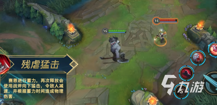 塞恩一技能叫殘虐勐?lián)?,玩家使用這個(gè)一技能的時(shí)候,可以躲在草叢里,然后等待一位敵方幸運(yùn)玩家的路過(guò),賽恩武器落下,可以擊暈敵人,蓄力時(shí)間越長(zhǎng),控制時(shí)間也就越長(zhǎng),并且能造成物理傷害,玩家可以配合家里高輸出的隊(duì)友一起蹲草叢,然后塞恩控制,輸出收割。