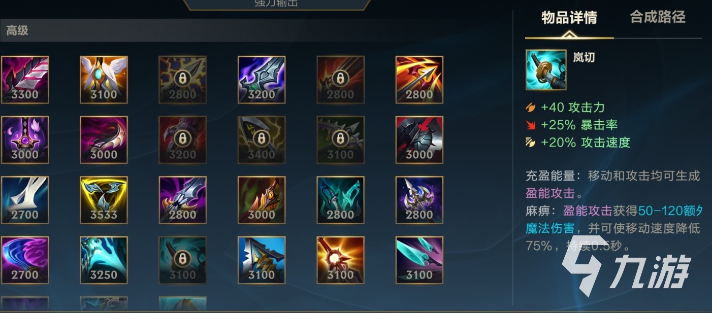 端游大家基本都是盾弓+收集者打底,但是手游沒有這兩件,但出裝還是要堆疊暴擊、穿甲、攻擊、攻速這些??膳c考慮嵐切作為首個大件,40點AD、25點暴擊、20%攻速,有充能后的額外傷害與減速效果,挺適合追擊的。