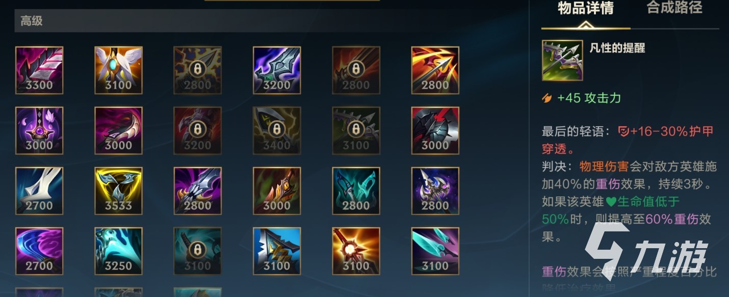 后續(xù)補上大穿甲,對應(yīng)手游里的凡性的提醒,不僅有高額護甲穿透更可以造成重傷效果。然后補個飲血劍提升攻擊的同時提升一點生存能力。當(dāng)然飲血劍也可以早點兒出。
