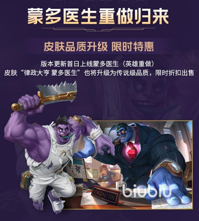 蒙多醫(yī)生重做,“律政大亨蒙多醫(yī)生”皮膚品質(zhì)上升為傳說(shuō),也將在更新后開(kāi)啟折扣出售。該英雄在游戲內(nèi)的的效果模型也將重做。