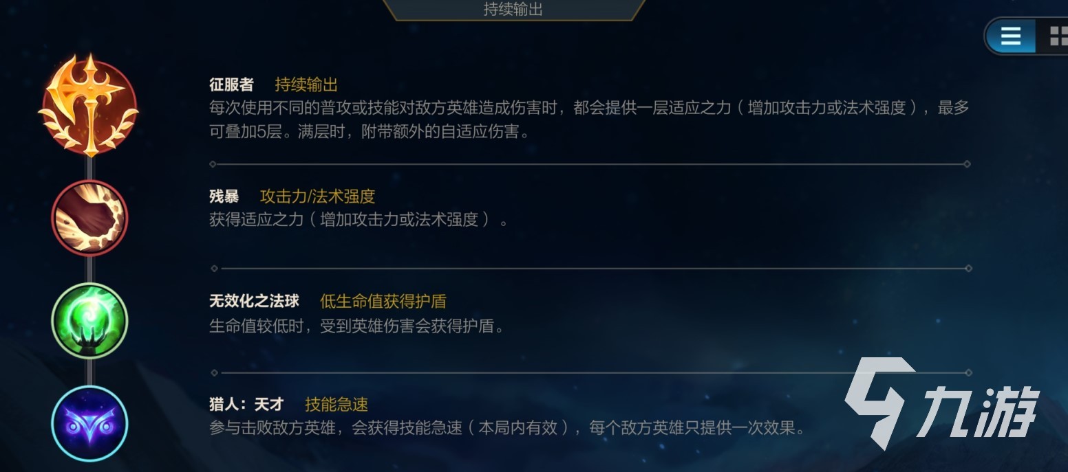 英雄聯(lián)盟手游中每個玩家只能攜帶4種符文天賦,因此選擇起來就比較容易了?;目梢赃x擇征服者或者迅捷步伐。一般遇事不決征服者總是沒錯的,疊法強疊滿加傷害,據(jù)說后面會從滿5層變?yōu)闈M6層,而且附加吸血效果,是個不錯的基礎選擇。