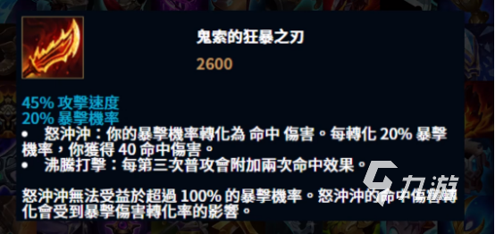效果:1、+45%攻速 +20%暴擊率;2、暴擊幾率將變成固定的額外傷害。3、每三次的普攻將會(huì)附帶兩次固定的額外傷害。