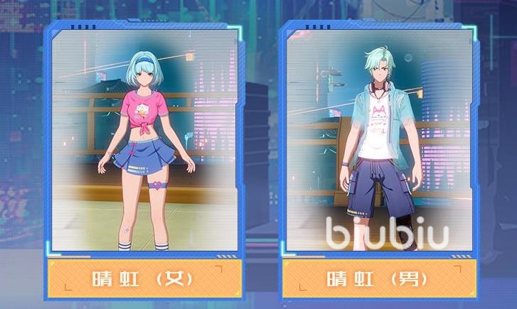 限定時(shí)裝晴虹,會(huì)在第六期通行證活動(dòng)結(jié)束之后的下一次維護(hù)更新中上架商城,價(jià)格為一千二百八十鈦晶。晴虹分為男女兩款,其中女款是粉色T恤上衣加藍(lán)色短裙,看起來(lái)青春活力,腿上還有藍(lán)色帶心型的綁帶。男款的是淺藍(lán)色外套加藍(lán)色工裝短褲。