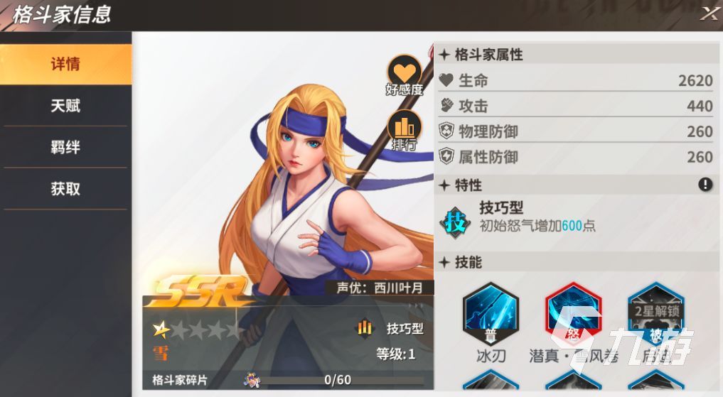 在技能方面,雪的普攻為冰刃,是一個單體輸出技能,可以打出百分百的屬性傷害;奧義技為潛真雪風(fēng)卷,主要針對敵人的前排目標(biāo),可以打出百分之一百三十五的屬性傷害,同時能夠無視對方的百分之二十的防御;