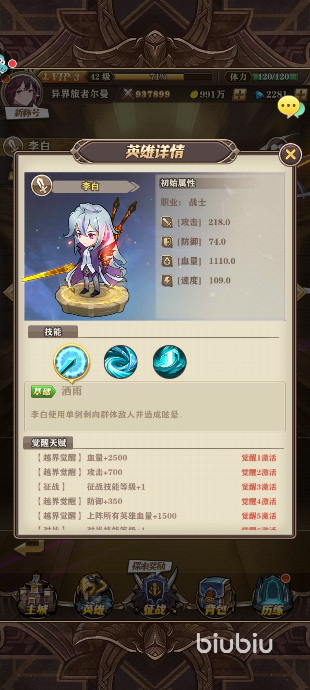 基礎技能:灑雨,李白運用劍氣向敵方群體刺出,并對敵方造成眩暈效果;戰(zhàn)斗技能:東風灑雨,在積攢五次劍氣后凝聚一股強烈的劍意攻擊敵人,在造成擊退效果的同時產生高額的AOE物理傷害;BUFF技能:長風萬里,李白為自己加持提升攻擊力buff,并造成兩倍的傷害。