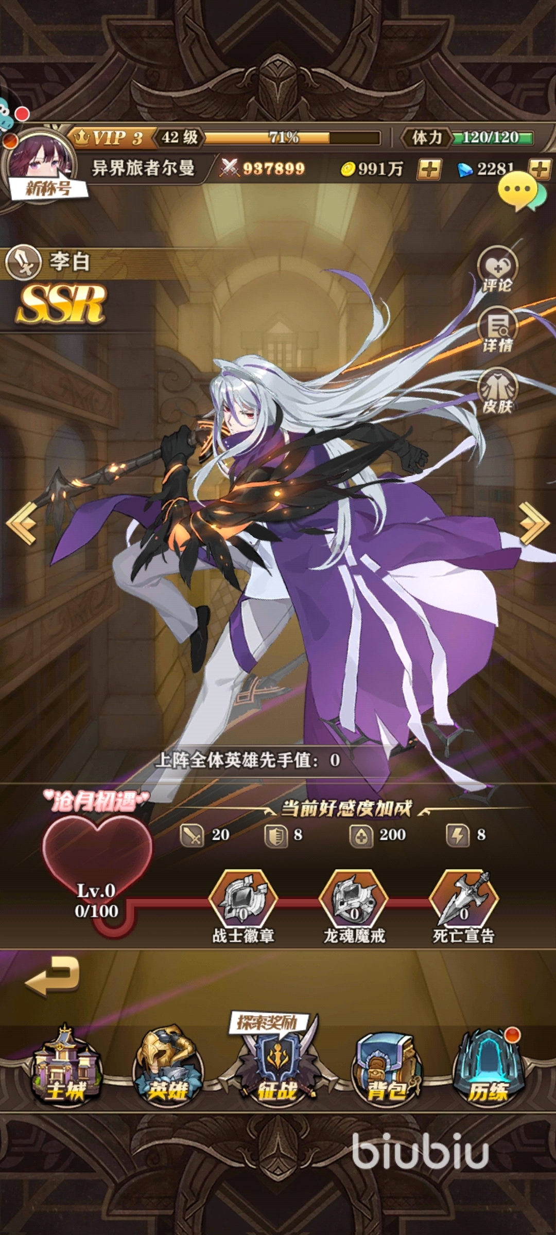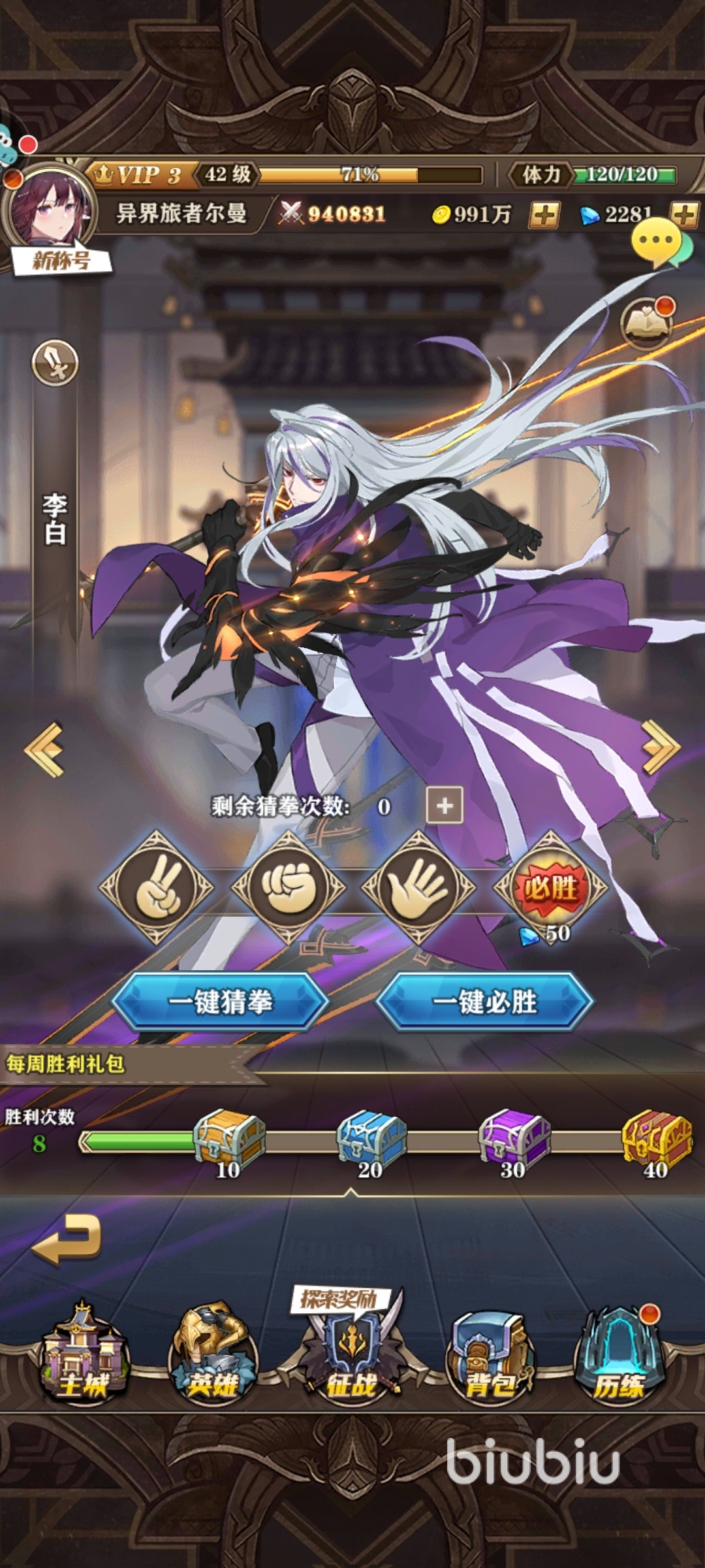 最后需要提醒各位玩家的是,玩家可以在游戲中找到休憩庭院,在其中與李白進行猜拳游戲,在游戲中可以收獲對應的戰(zhàn)士勛章。而戰(zhàn)士勛章在通過贈送之后會提升玩家與角色的好感度,好感度每次提升之后就會對李白的四維屬性進行加成,從而提升李白這個角色的戰(zhàn)斗力。每天有五次免費的猜拳機會,如果緊急需要提升戰(zhàn)斗力的情況下,可以花費200枚鉆石購買猜拳次數哦。