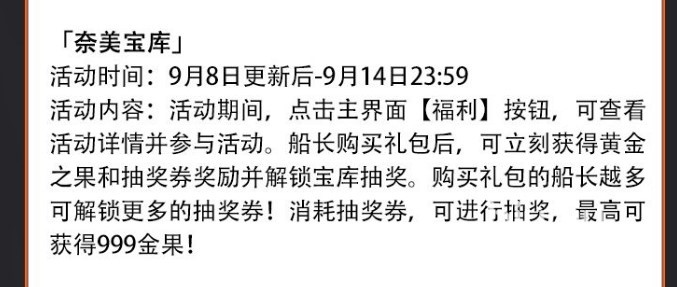 第二個(gè)環(huán)節(jié)是娜美寶庫,在中秋活動(dòng)中購買禮包可以直接在此處領(lǐng)取大量果實(shí)獎(jiǎng)勵(lì)和抽獎(jiǎng)券,最多可以獲得九百九十九個(gè)果實(shí),累計(jì)消費(fèi)還可以獲得特殊道具。