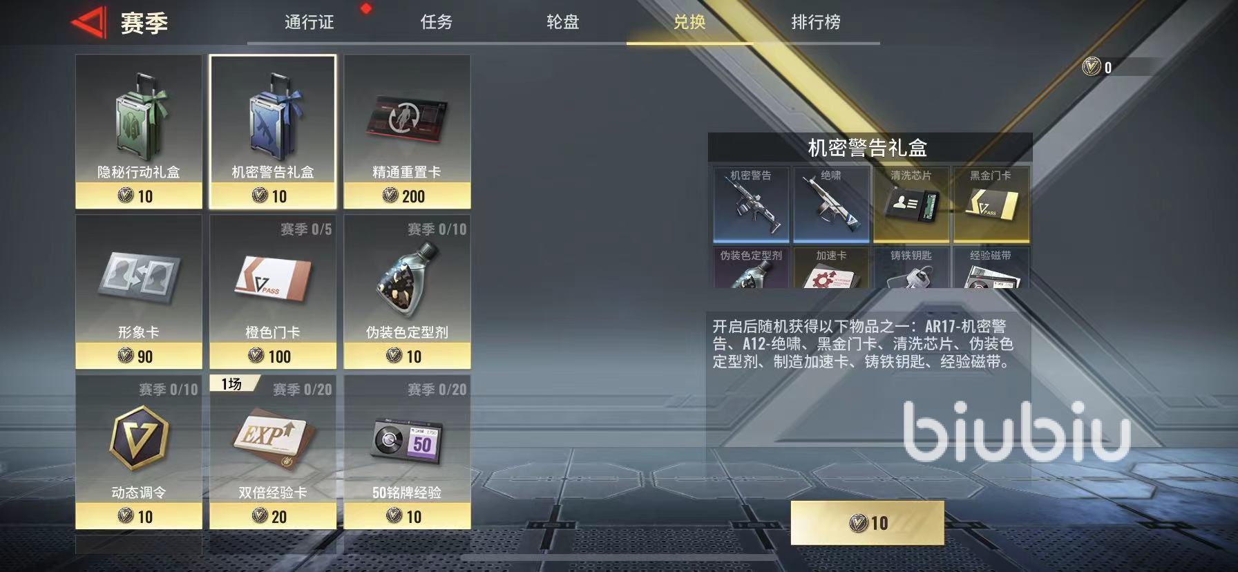 機密警告禮盒是賽季內的一個限定道具,玩家可以在游戲主頁面點擊賽季圖標,進入到賽季兌換界面,花費10個硅芯幣即可兌換一個機密警告禮盒,兌換之后玩家可在背包內打開該禮盒,開啟后玩家將隨機獲得以下商品:AR17機密警告涂裝,A12絕嘯涂裝,黑金門卡,清洗芯片,偽裝色定型劑,制造加速卡,鑄鐵鑰匙,經驗磁帶。