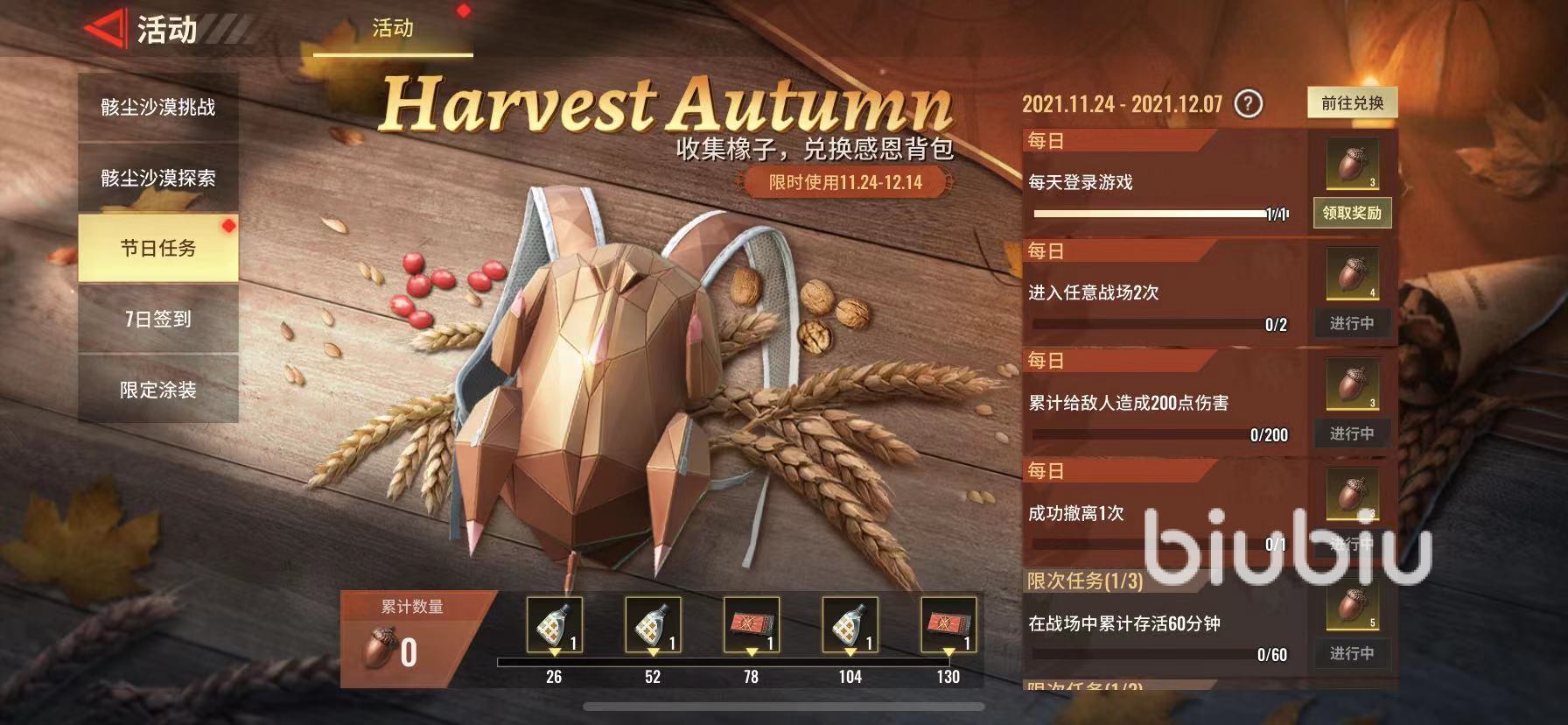 目前游戲內(nèi)獲取這個(gè)背包的方法一共有兩種,第一種是通過做任務(wù)的方法獲取,玩家可在11月24日到12月14日登陸游戲,在活動(dòng)界面有一個(gè)節(jié)日任務(wù)的板塊,點(diǎn)進(jìn)去就能看到每日任務(wù)了,完成任務(wù)可以獲取一定數(shù)量的橡子,當(dāng)橡子累計(jì)攢到178個(gè),玩家就能在活動(dòng)商城兌換感恩背包了。
