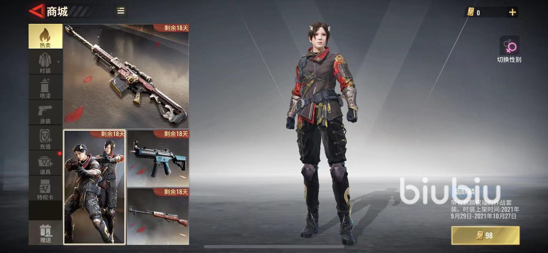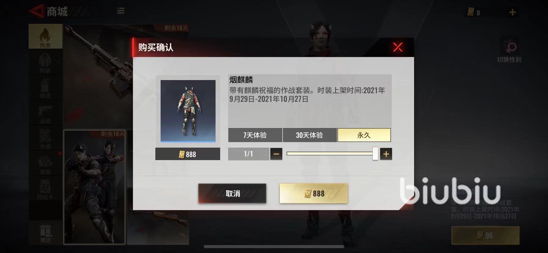 煙麒麟套裝是最近十月剛剛上線的全新服飾,目前游戲內(nèi)獲取該服飾的方法一共有三種,第一種是通過商店購買獲取,玩家可在游戲主頁面左側(cè)找到商城建筑,在首頁熱賣板塊就會有煙麒麟的購買鏈接,購買永久時裝需要用到888點券,另外還有七天和三十天體驗版,分別售價98點券以及298點券。