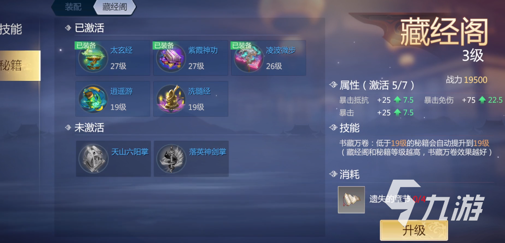 那么想要進(jìn)行升級的話,是需要達(dá)到一些條件的。最為基礎(chǔ)I且重要的就是當(dāng)前等級的秘籍收集進(jìn)度,大家在界面中可以看到,當(dāng)前三級的藏經(jīng)閣是需要收集七本秘籍的。而小編當(dāng)前只有五本秘籍,還有兩本秘籍是沒有獲得的,在右邊顯示是沒有激活的。而想要進(jìn)行升級的話,是需要將這基本秘籍全部激活才行的,這個(gè)要求還是有一定難度的,而且隨著藏經(jīng)閣等級的提升,需要的秘籍也是有一定提升的。