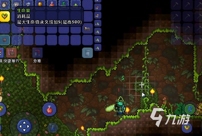 而在將生命值提升到400點之后,想要再往上提升就需要使用生命果了。一個生命果實可以為我們帶來5點的最大生命值成長,那么在使用了20顆生命果之后,我們的生命值上限也就達到了500點。而想要獲取生命果我們需要達成兩個條件,第一個就是擊敗肉山進入到游戲的困難模式。第二個就是我們必須打敗游戲中的一個機械boss。這樣生命果就會再地下叢林的叢林草上生長了。