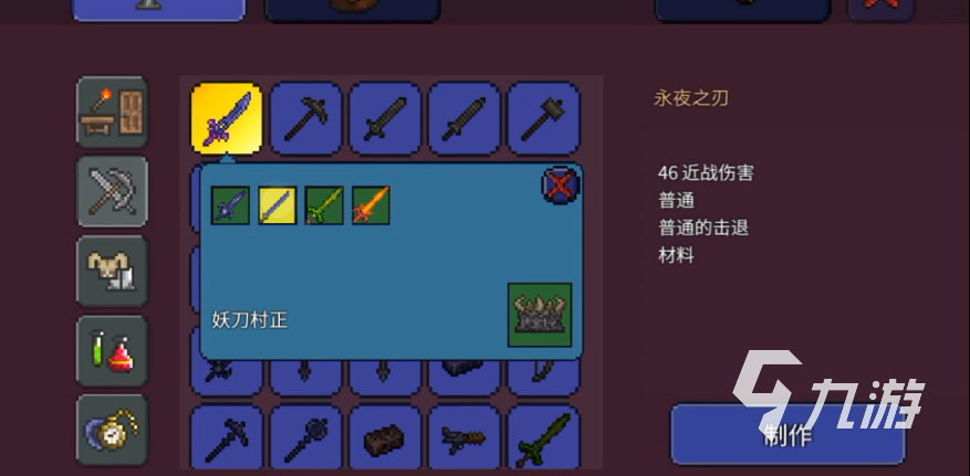 合成永夜之刃所需要的四把武器分別是:光之驅(qū)逐,草薙,村正大刀和熔巖劍。這四把武器的獲取難度比起永夜之刃而言有過之而無不及,首先是光之驅(qū)逐,光之驅(qū)逐可以使用10個魔金礦或者10個熔巖錠來合成,魔金礦只有天空島上才有而熔巖錠則需要在地獄得到。草薙可以通過叢林孢子和蜂刺合成獲得,這兩樣道具都是叢林地形的專屬道具,需要花費很長時間尋找。村正大刀則需要開啟黃金寶箱才有概率獲得,熔巖劍相對簡單,挖地獄礦就能得到。