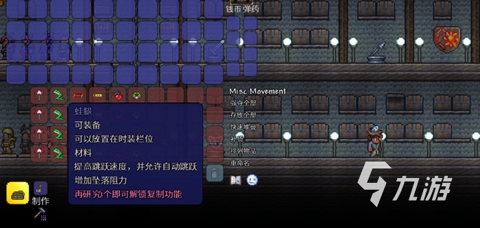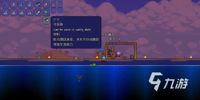 泰拉瑞亞游戲中的武器裝備系統(tǒng)還有一個叫做配飾,通過穿戴配飾我們就可以獲取配飾自帶的一些加成效果。而蛙腿就是前期非常好用的配飾之一,其稀有度為藍色,穿戴的效果是可以提升我們跳躍的速度、使我們的跳躍高度翻倍、并且允許我們進行自動跳躍,而通過裝備蛙腿我們也可以獲得極高的掉落傷害抗性,裝備了蛙腿之后我們可以掉落40格的距離而不受到傷害。而蛙腿搭配上攀爬爪或者是其他攀爬、飛行配飾可以讓我們在游戲的前期就能夠到達大部分的地形。