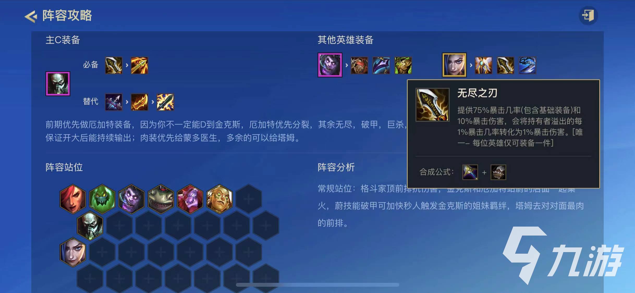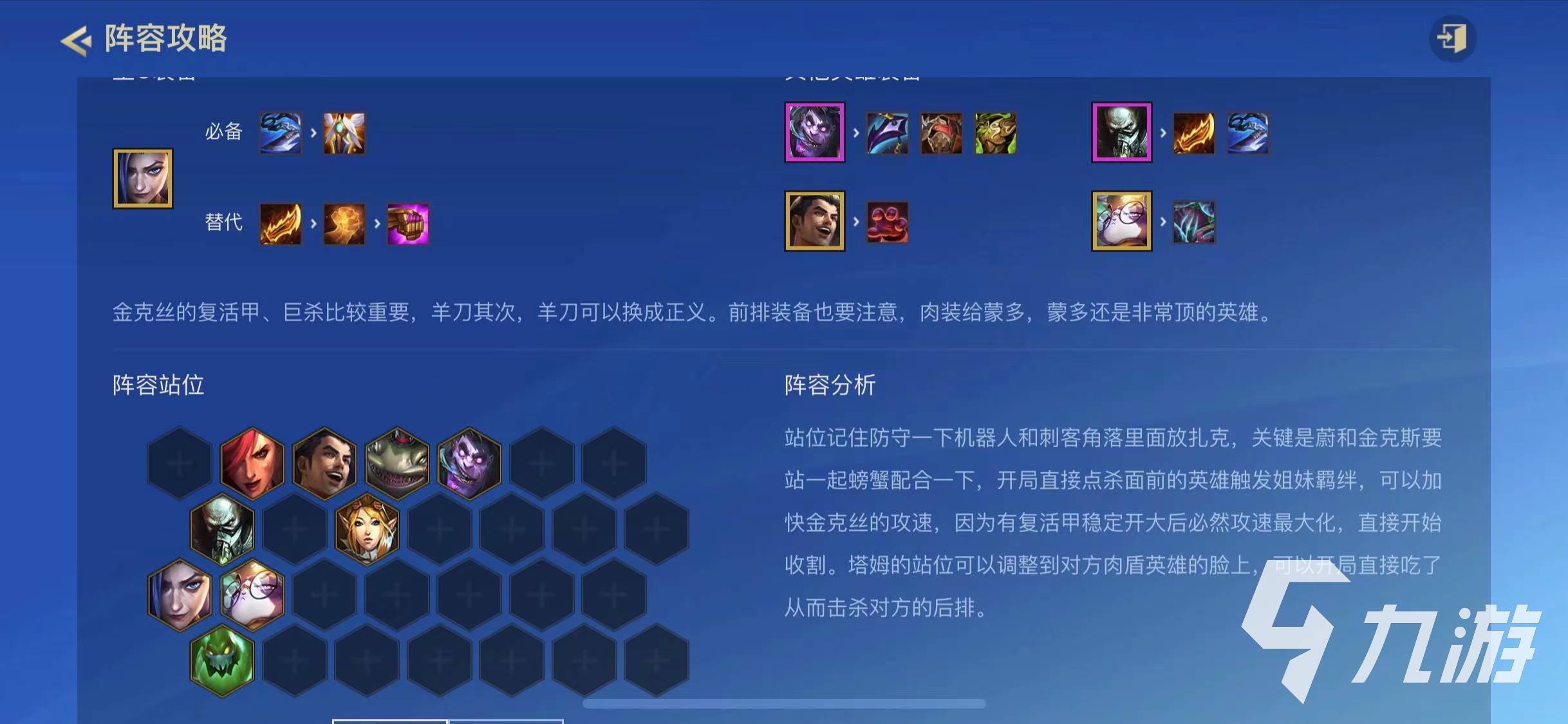 在大家升級六人口的時(shí)候,最好能把一費(fèi)卡搜到三星,在低費(fèi)卡都升星以后,就可以速八了,一定要留維克托和卡莎的位置,到了兩級以后就可以直接放出去,另外就是站位,要注意C位避開刺客,不要集中站位,這樣就可以穩(wěn)定打出輸出,金克絲是核心,如果能升級到兩星,基本上是沒有什么前排能抗住的。