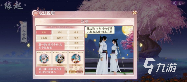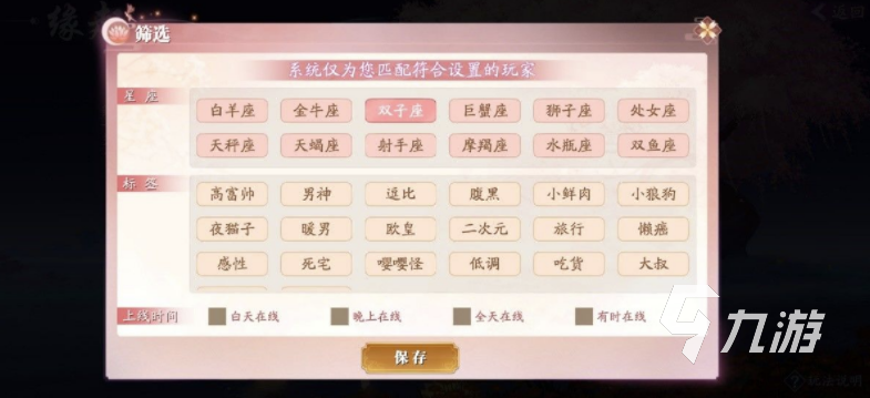 在這款游戲里邊有個(gè)情緣玩法,可以通過個(gè)性匹配良緣,從而給玩家精心設(shè)置了標(biāo)簽,星座跟在線時(shí)間的相關(guān)條件,玩家們就可以通過標(biāo)簽匹配心儀的對(duì)象了,每位玩家都是可以得到五位有緣人的。