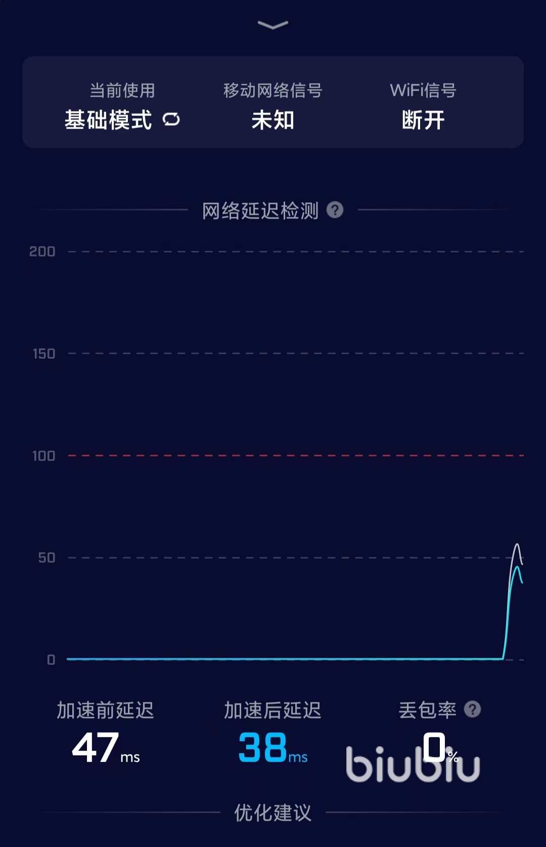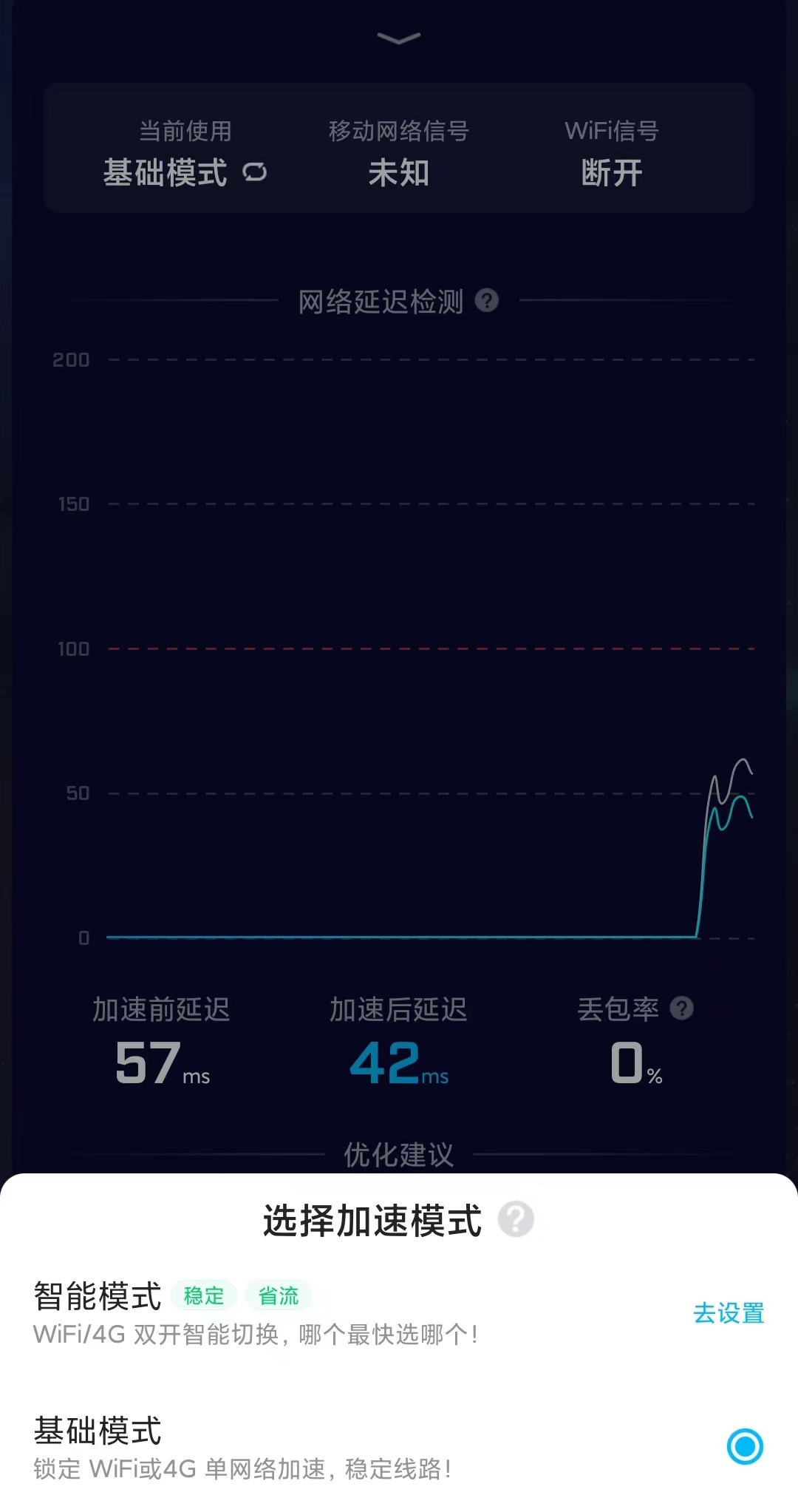加速界面比較簡潔,玩家只需要了解中間的圓圈按鈕和下面的切換模式按鈕即可。切換模式按鈕是為了提高加速效率而設置的,如果想切換模式,必須手動操作。操作步驟就是點擊屏幕上的循環(huán)按鈕,在下方跳出來的彈窗里選擇自己喜歡的模式即可,一般默認為基礎模式。