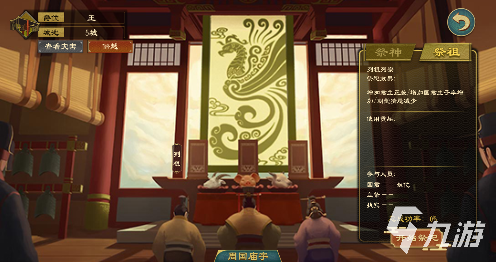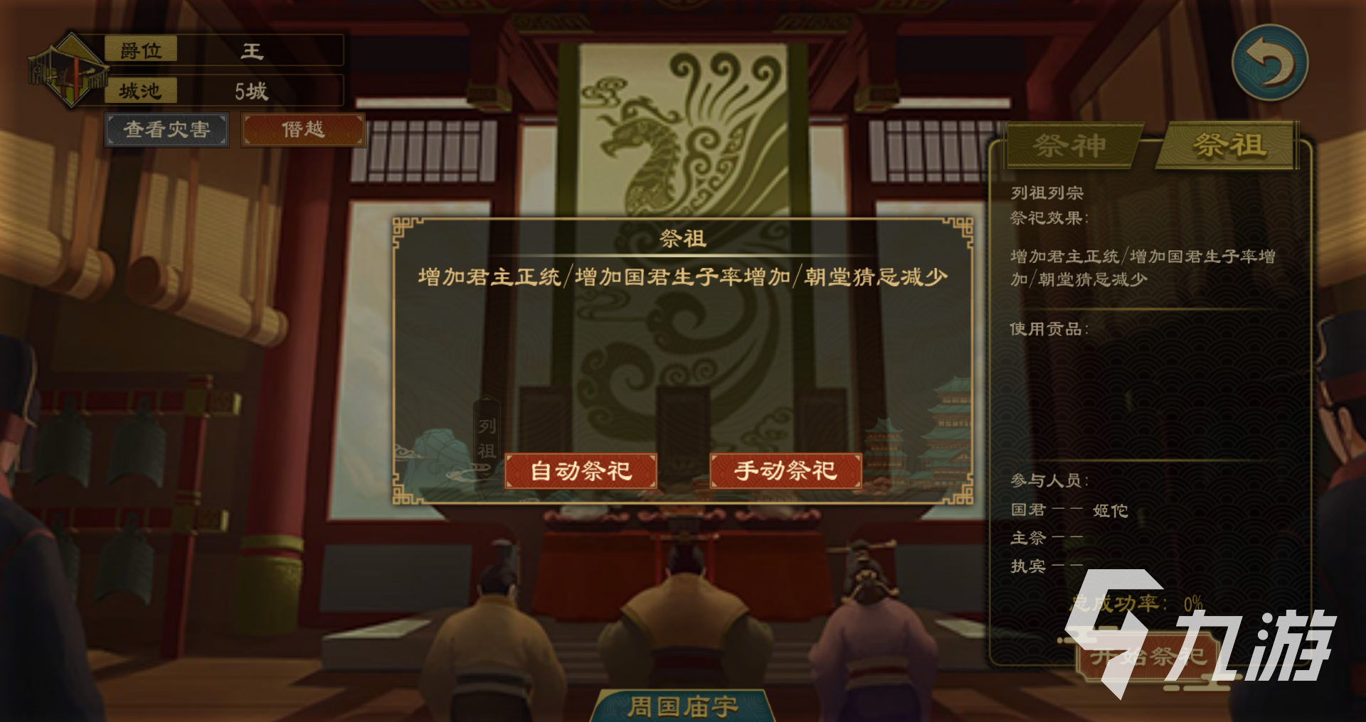 祭祖也不是隨隨便便就能進行的,這是要有一套流程的,而且每年都只能進行一次。只要能夠成功祭祖那么就能提升一定的君主正統(tǒng),還能夠提升國君的生子率和降低朝堂的猜忌值。