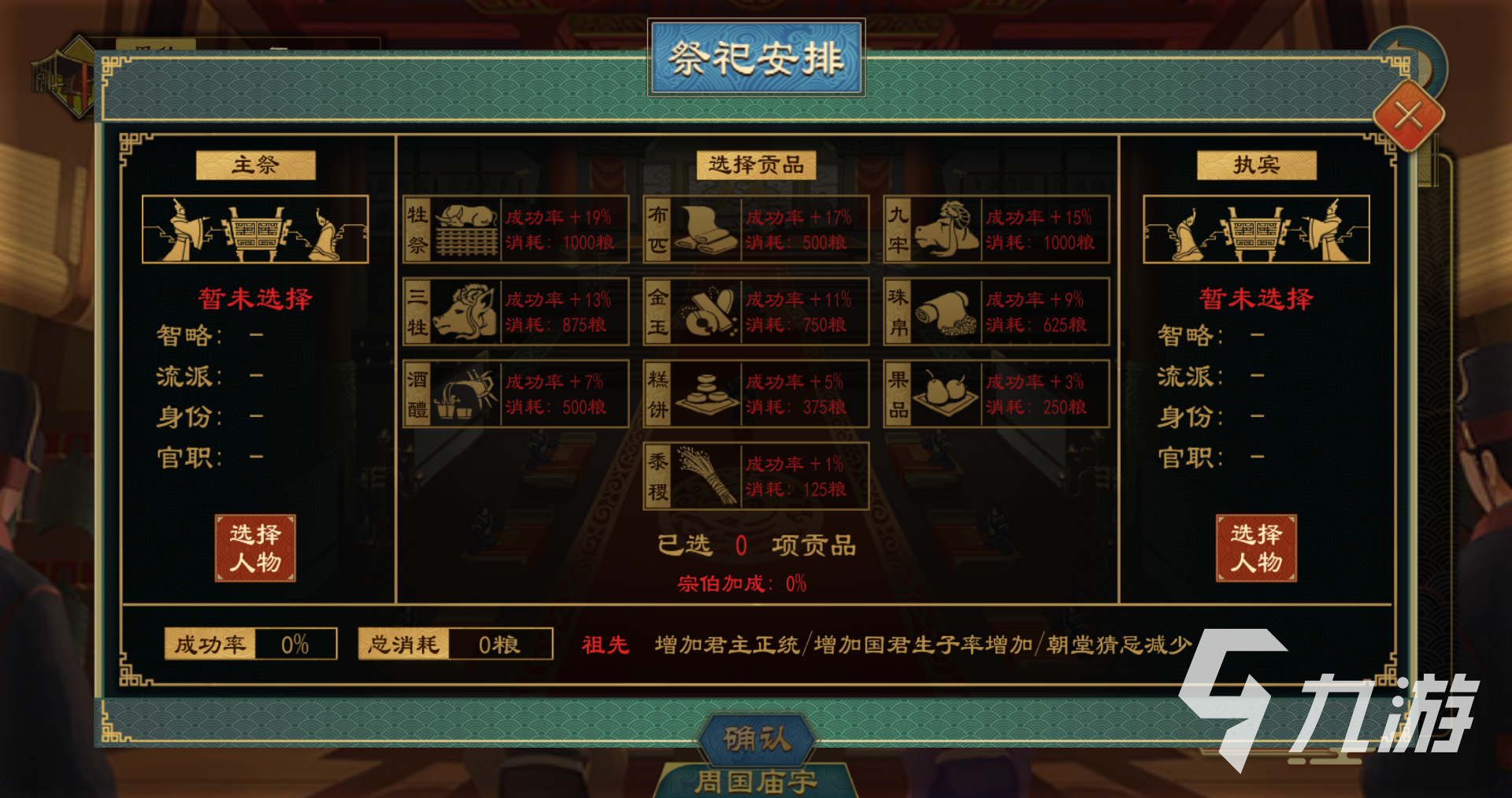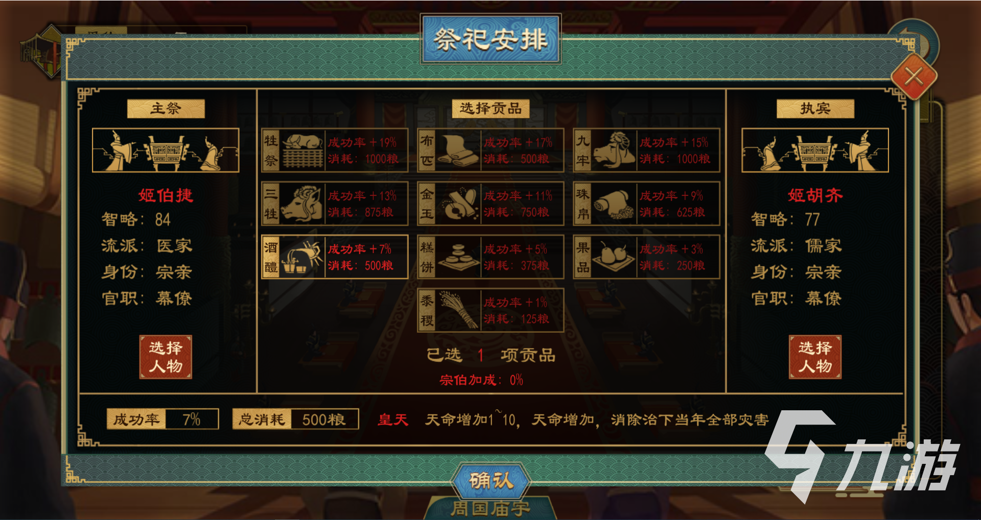 在此游中的祭祀方式還分為自動與手動兩種,其中自動的放回寺是取最高的概率進行祭祀,而手動就是需要玩家自己再進一步操作,這會進入祭祀安排的界面,這時候就需要玩家在這里進行主祭和執(zhí)賓的選擇,然后再挑選貢品來提高成功率。