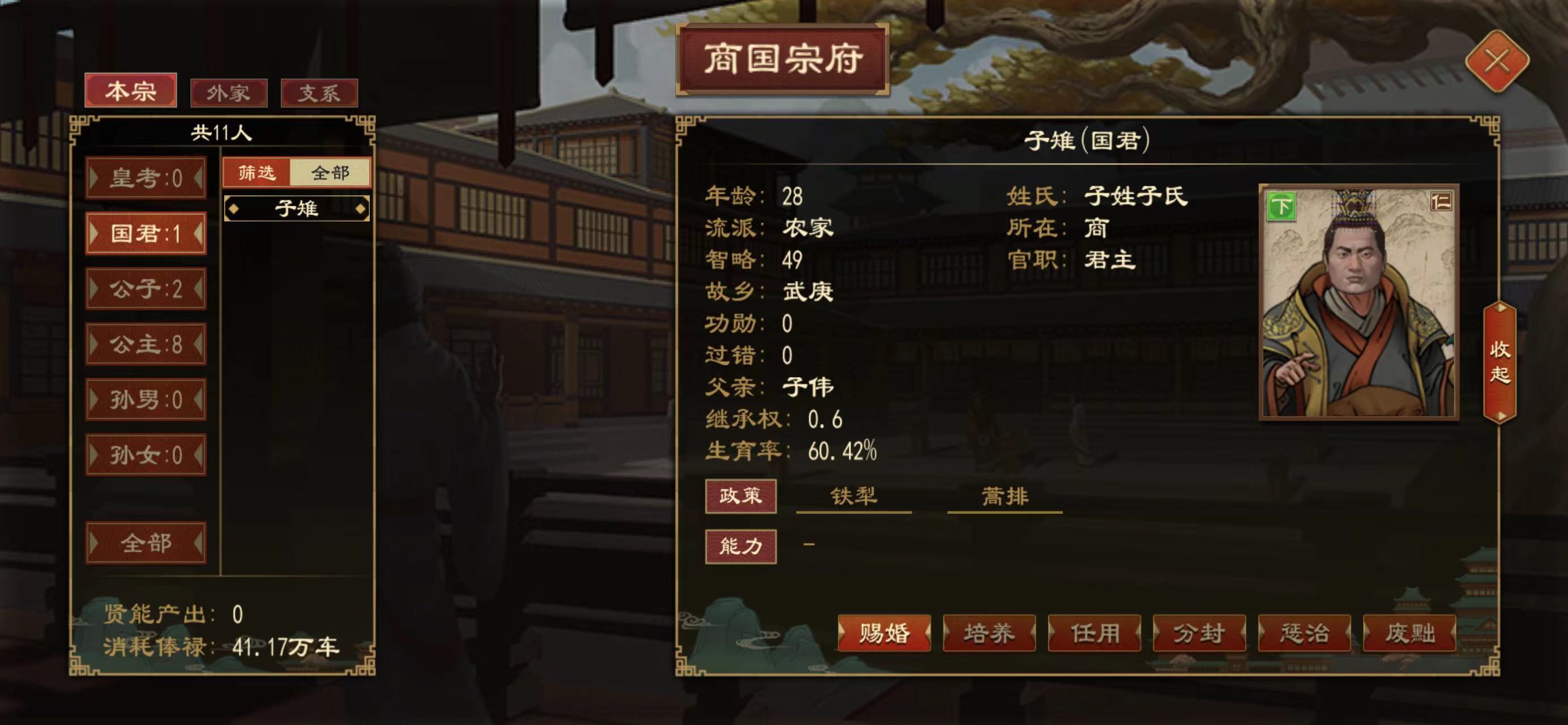 在游戲里想要延續(xù)自己的后代,就需要學(xué)會(huì)挑選有才能的人來(lái)?yè)?dān)任太保,這樣能夠提高宗室的生育能力。如果是想要設(shè)立繼承人,那么就可以在宗府里查詢子嗣,這里會(huì)有每個(gè)孩子的年齡,智商和繼承權(quán)等屬性可以觀看,繼承權(quán)高的那個(gè)人在立其為儲(chǔ)君之后,會(huì)有大概率可以提升正統(tǒng)性。