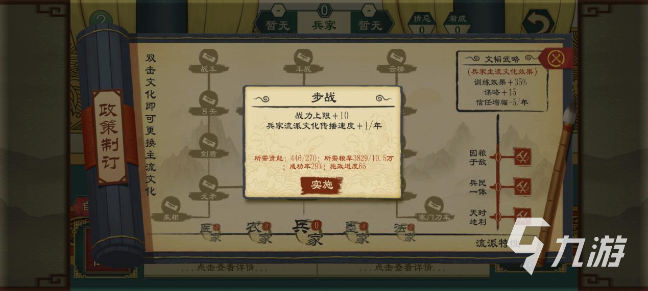 2、比如儒家的流派,可以增加君王威望值。兵家的流派,則是可以提升訓(xùn)練的速度。而墨家的流派,則是可以提升速度等等。因此要在在不同時(shí)期,使用不同的政策來(lái)進(jìn)行發(fā)展。