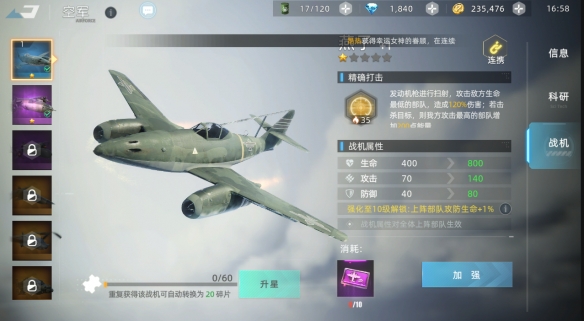 此外,小伙伴們也能對(duì)自己獲得的空軍戰(zhàn)機(jī)進(jìn)行培養(yǎng)強(qiáng)化,而這一操作就位于戰(zhàn)機(jī)界面,只要提前收集好相應(yīng)的零件材料,就能對(duì)不同的戰(zhàn)機(jī)進(jìn)行加強(qiáng)提升了。至于這些零件材料從何而來(lái)呢?自然也是有其獲取途徑的,就是戰(zhàn)地突襲等活動(dòng)玩法了。