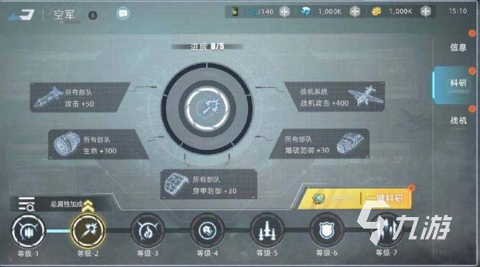 戰(zhàn)機養(yǎng)成:游戲當(dāng)中的戰(zhàn)機,是我們的重要養(yǎng)成玩法之一,首先這個玩法可以讓我們的所有部隊都獲得屬性的加成效果,而且隨著解鎖的等級越高,加成的效果也會更加強大。這里面大家需要收集材料解鎖科研等級,然后每一個科研等級有著五個不同的屬性可以解鎖。個人建議遇到相關(guān)材料及時獲取,畢竟加成的屬性確實是非常多的。