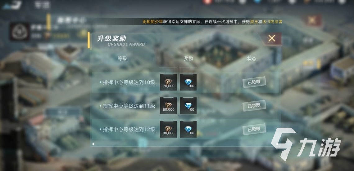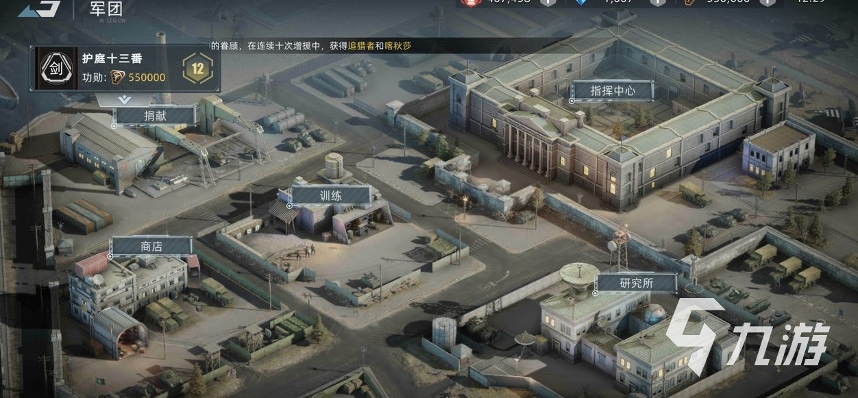 隨后,我們來看看軍團的具體的功能吧。如圖所示是軍團的主界面。指揮中心可以查看軍團的一些具體信息。一些高級的軍團則有鉆石獎勵,領取的時候可以點開指揮中心,然后點建筑,然后再點升級獎勵就可以領到相應的獎勵了。