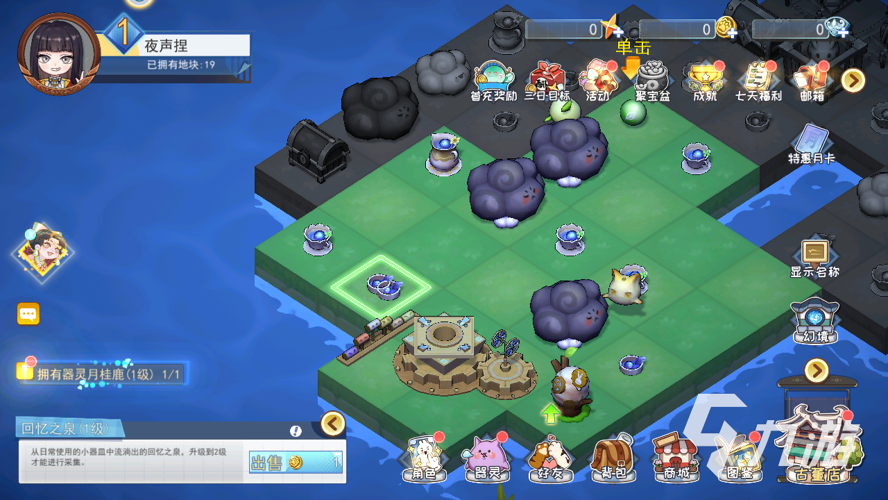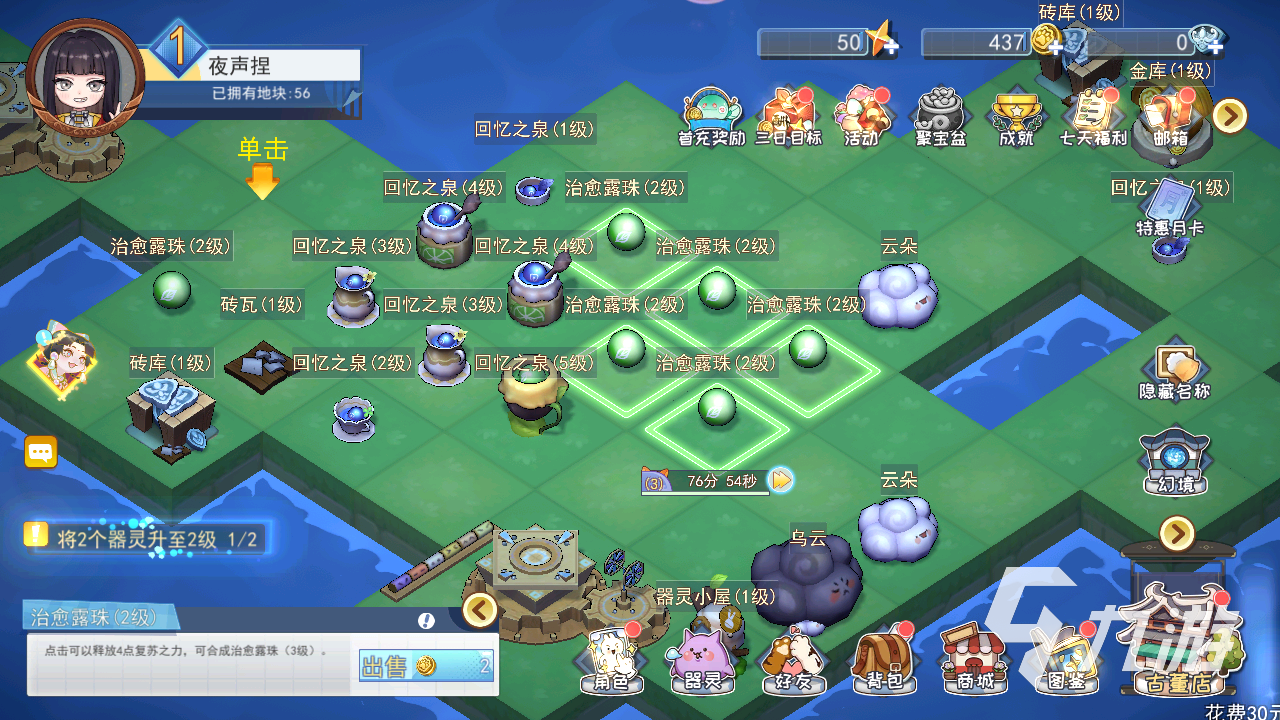 而多個白云合成會有獎勵,比如五個白云就可以合成出六個一級的回憶之泉,那么回憶之泉,治愈露珠,錢幣的合成也遵循這個獎勵機制,合成的個數(shù)越多,獎勵越豐厚,對黑色地塊的浸潤值就越高。