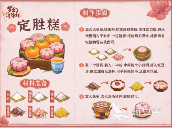由于此游戲目前還沒有正式上線,所推出的菜譜樣子還是比較少的,比如首先第1種特色菜譜,那就是定勝糕,軟軟糯糯的造型,口感又非常甜美,這很多顧客都特別喜歡的美食,在制作此美食的過程當中,所有的食材都可通過消除的玩法輕松獲得,在每次消除之后就可以獲得很多面粉或者是牛奶以及制作此菜品時,需用到的各種食材等等,經(jīng)過自己的一手操作之后,就可提升其中角色的屬性。