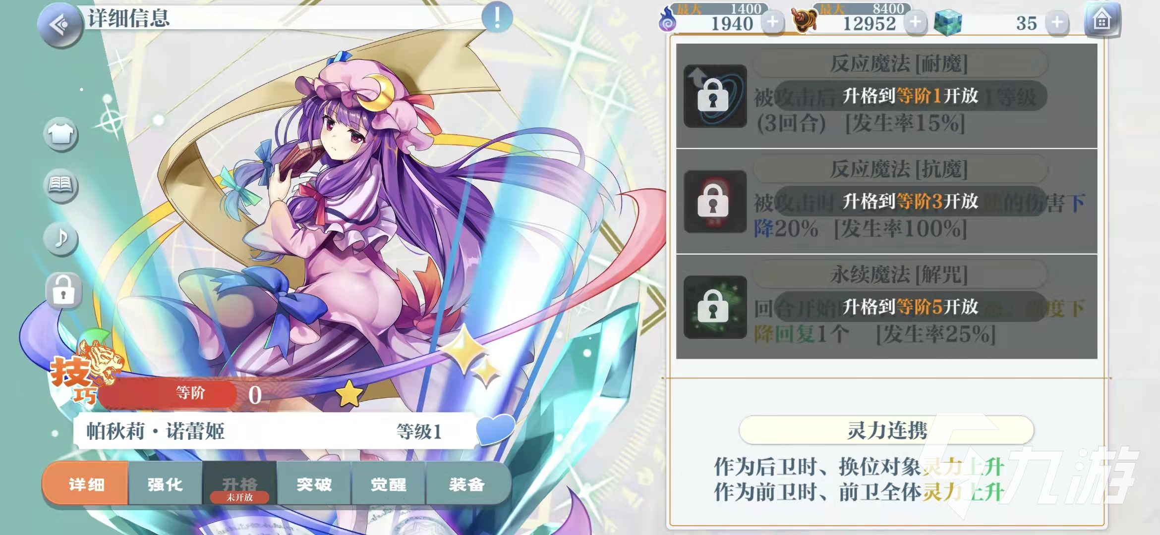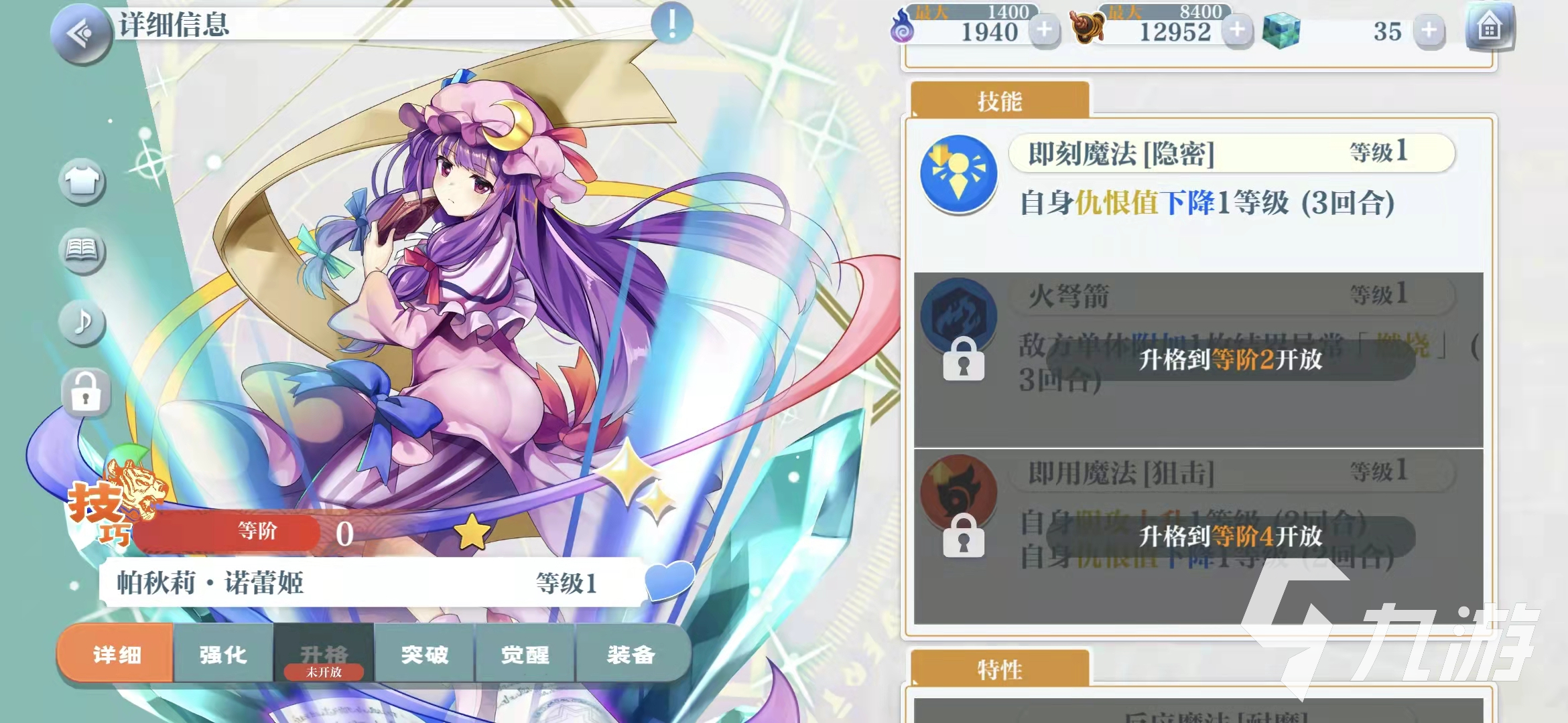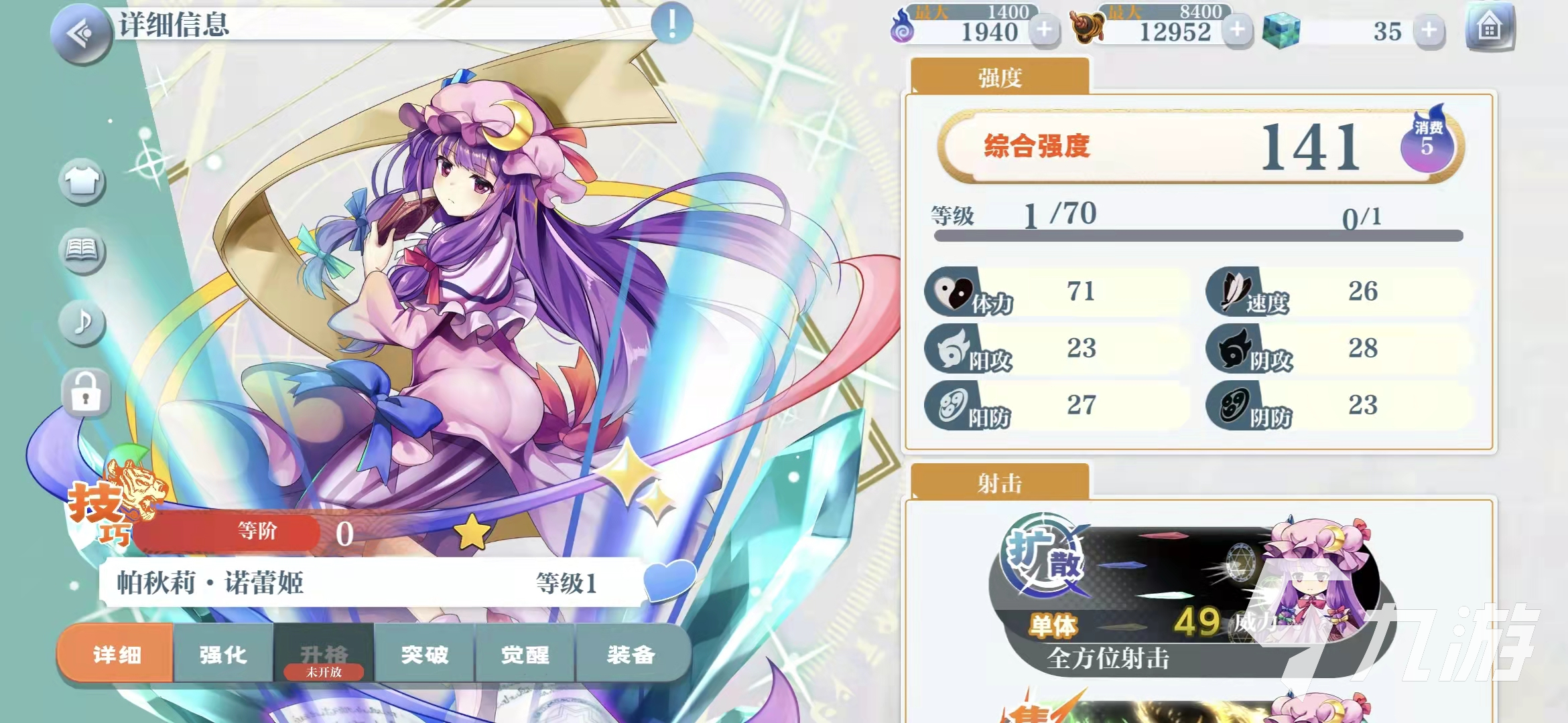 首先我們可以看一下帕秋莉這個人物的角色面板,這個人物并沒有太高的數(shù)值,除了它的陽防和陰攻比較高。這個角色的第一個技能威力非常強大,叫做全方位射擊,而她的魔法技能也是非常有用,第一個就是可以將自己的仇恨值下降。還可以給敵人的單體附加一個結(jié)界異常,也就是能夠燃燒敵人,最后還可以將自己的部分屬性上升。
