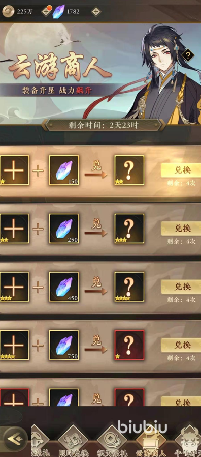 游戲中的云游商人并不是一個NPC,客觀地來說應(yīng)該是一個系統(tǒng)商城。玩家們可以在該系統(tǒng)中購買到許多特殊的商品,但是該系統(tǒng)是在有活動時才會限時開放的,有一定的時間限制,想要購買東西一定要在限定的開放時間內(nèi)。玩家們在主城的右上角可以看到“限時活動”的圖標(biāo),點(diǎn)擊進(jìn)入后滑動下方的界面可以進(jìn)入“云游商人”系統(tǒng)??梢栽谠摻缑婵吹交顒拥氖S鄷r間,時間結(jié)束后該系統(tǒng)會關(guān)閉。