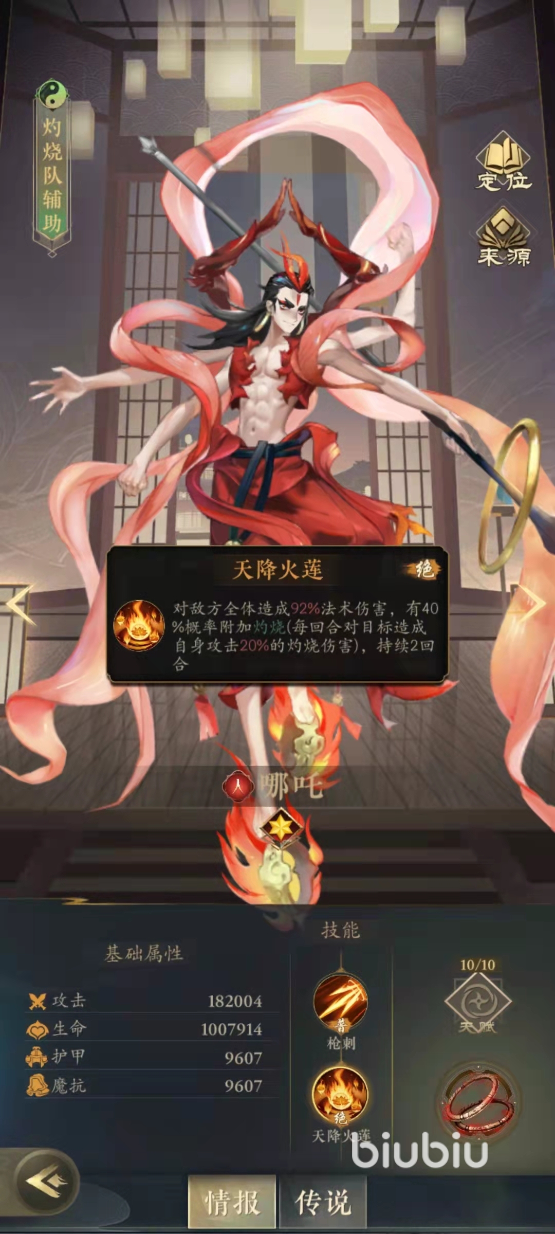 哪吒是屬于人族陣營的神將,在介紹中被定為成了輔助,但是哪吒這個輔助并不是一般意義的輔助,而是整個人族陣容中的核心。哪吒的絕技天降火蓮,效果是可以對敵方全體神將造成傷害,并且有幾率附加灼燒效果。被灼燒的目標,在持續(xù)的時間內,每個回合都會持續(xù)掉血。灼燒效果單論傷害并不高,但是最重要的作用是為人族的其他神將提供幫助。