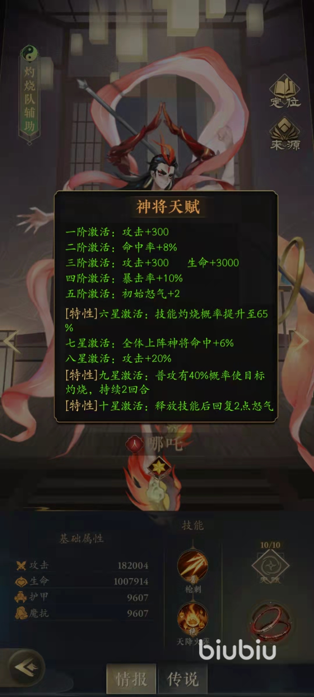 哪吒的升星之后的天賦被動技能也很給力,在達到六星的時候,可以將技能附加的灼燒幾率提升到百分之六十五,如果對方是六人的滿員隊伍,那么一次技能至少能讓三名以上的敵人被灼燒。在升星達到九星的時候,哪吒的普攻也有幾率將傷害目標灼燒,哪吒的普通攻擊傷害的是敵方的前排,所以也會至少灼燒一個前排神將。在十星的時候,哪吒釋放完技能之后,額外恢復兩點怒氣,這兩點怒氣就使得哪吒可以在最短的時間內打出兩次技能,這樣就基本上實現(xiàn)灼燒全覆蓋了。