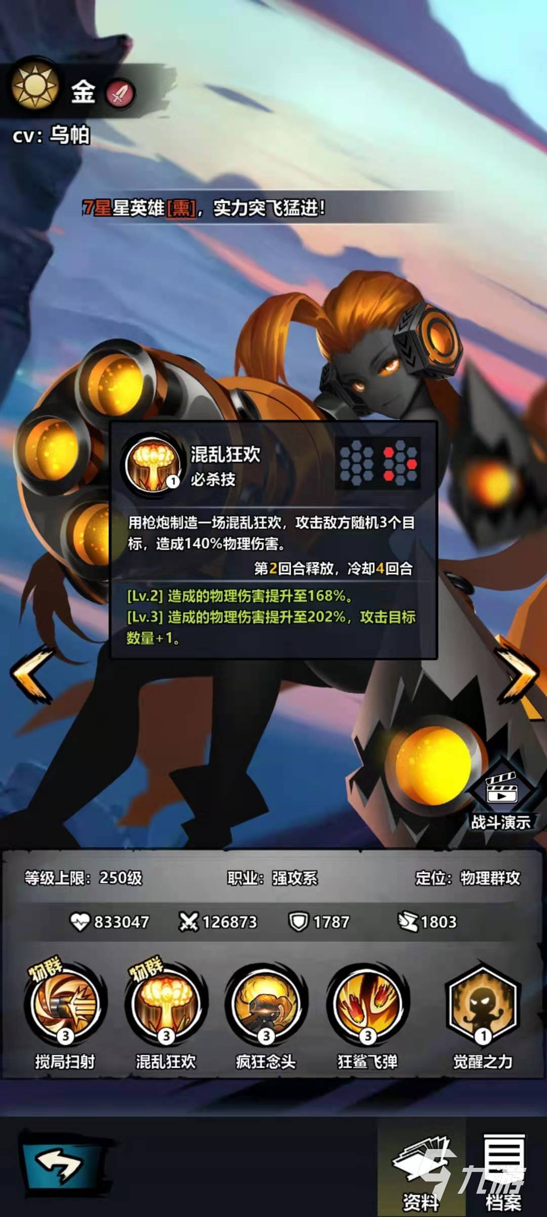 金的必殺技是混亂狂歡,隨機選擇傷害目標,升級之后最多可以選擇四個目標,這個技能如果是可以在疊加滿之后在釋放,可以說是所有的英雄中傷害最高的一類技能。這個還有一個主動技能是攪局掃射,可以傷害敵方人數(shù)最多的一列,這樣的選擇可以保證傷害的人數(shù)最大化,不僅傷害高,還有幾率附加攻擊下降的減益狀態(tài)。