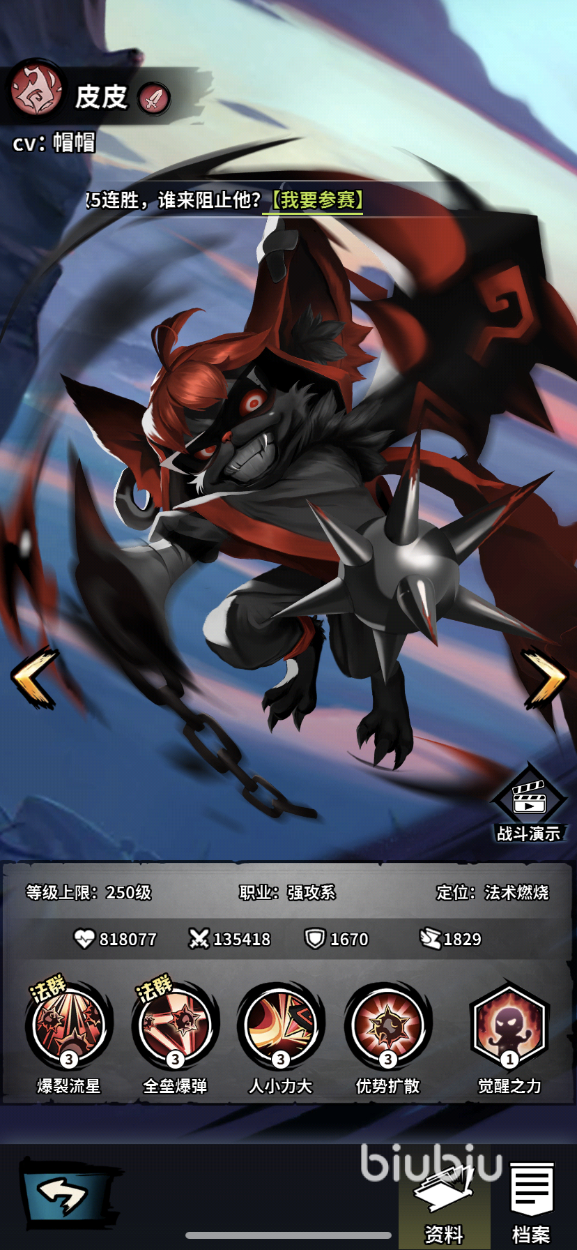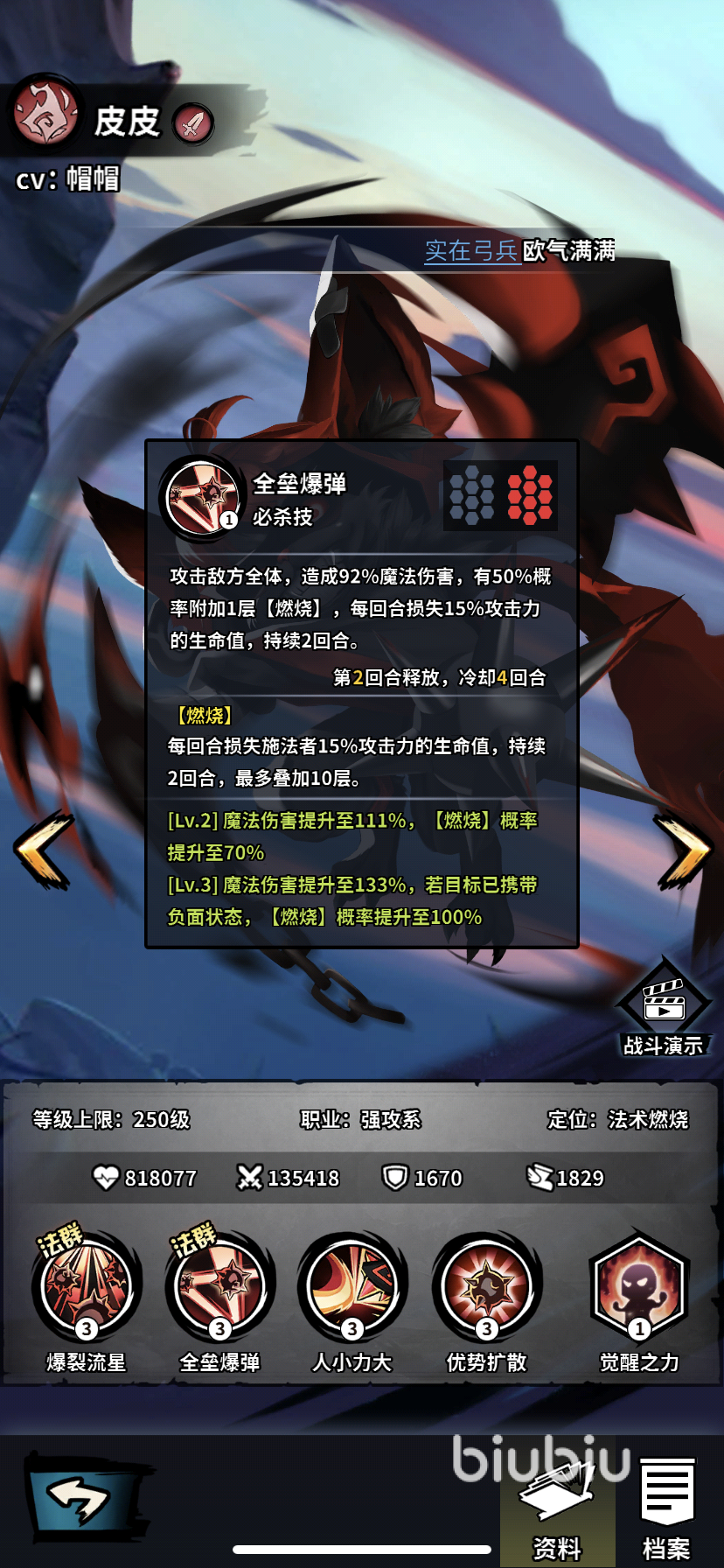 從職業(yè)上看皮皮屬于游戲內(nèi)的強攻系角色,它的定位為法術燃燒傷害,帶有一定的持續(xù)效果。皮皮是游戲內(nèi)品質(zhì)最高的傳奇英雄,生命以及攻擊力都是游戲內(nèi)數(shù)一數(shù)二的,它的輸出主要以法術攻擊為主。被動效果為覺醒之力,每戰(zhàn)斗三回合將觸發(fā)一次,在第4次攻擊的時候,攻擊將提升30%,暴擊也將提升15%。