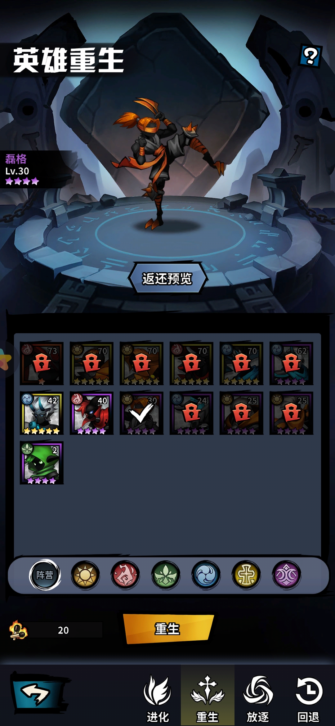 1、可以對(duì)選中的英雄進(jìn)行回退,回退后英雄等級(jí)變?yōu)?級(jí),并犯壞英雄全部本體和進(jìn)化時(shí)所消耗的等額4星隨機(jī)英雄卡,還有所有升級(jí)和轉(zhuǎn)生消耗,其穿戴的裝備也會(huì)被返還進(jìn)背包中;