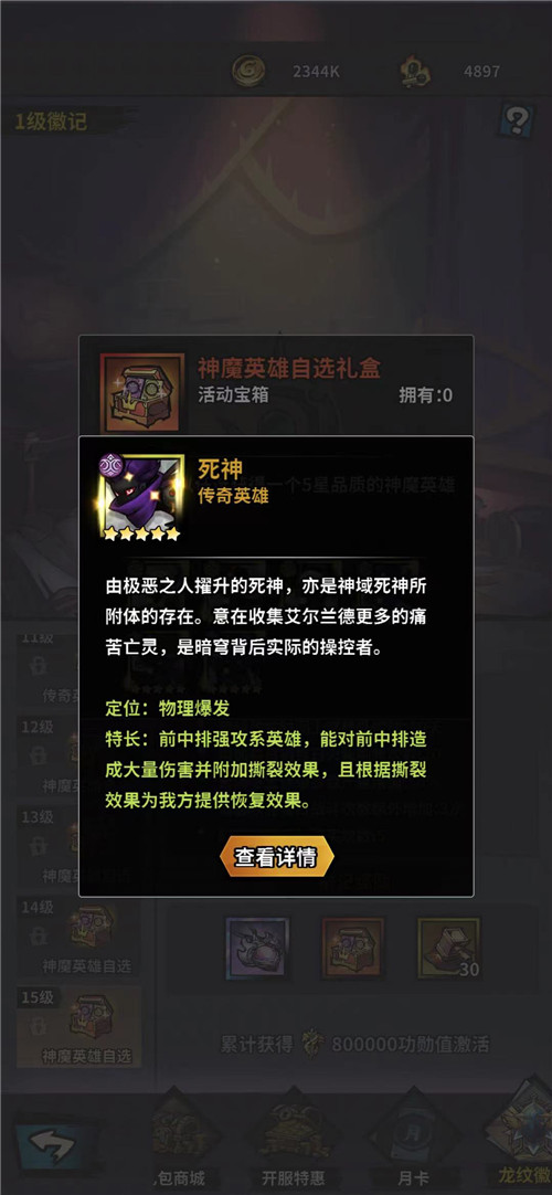1、玩家可以通過升級龍紋徽記至15級(需8萬RMB),會贈送一個神魔英雄禮包,玩家可以在禮包中選擇一名英雄,其中就包括死神。
